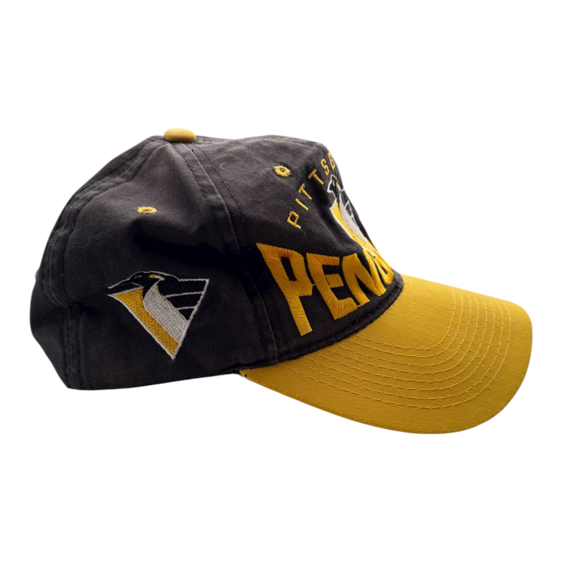 Represent your team in classic retro style with this vintage Pittsburgh Penguins cap. Featuring the bold Penguins logo embroidery and authentic ‘90s design, this cap is a must-have piece for fans and vintage collectors alike. In vintage condition – black fabric shows light fading that adds to its vintage charm.